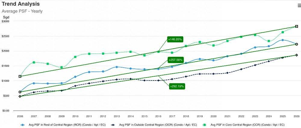 Although RCR properties appreciated by 257.56% over the past two decades – higher than the CCR’s 146.25% but lower than the OCR’s 295.89% – they still offer a compelling investment proposition.